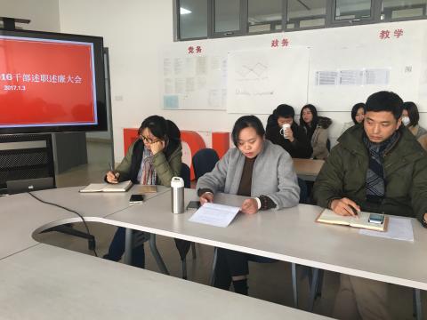 为进一步加强中层干部队伍建设,客观评价干部的实绩,提高干部的整体素质,1月3日下午,我系2016年度中层干部述职述廉大会在会议室召开。全体教师参会,学院周东华院长、人事处李慧敏主持会议。