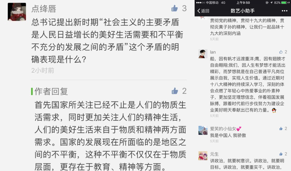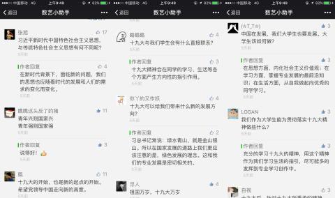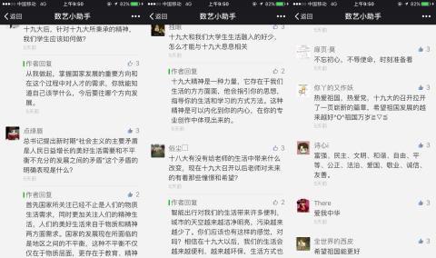 观看完短片后,利用系部师生互动平台(微信小助手公众号),进行师生在线讨论,组织党员教师线上互动答疑解惑,结合十九大精神大学生如何贯彻,倾听学生的心声,同学们积极参与,有同学提出新时代中国特色社会主义思想与传统特色社会主义思想有何不同,十九大会给我们带来什么新的发展方向,有的同学则提出,十九大与我们学生有什么直接联系,还有同学关心在十九大召开后,中国迅速发展,大学生要发展,该如何做?大学生如何贯彻十九大精神,问题从大到小,与自己的生活息息相关,与国家的发展息息相关,可见对十九大报告进行了认真的学习与研究。老师们兼具广度与深度而又贴近生活地一一给予回应或建议。通过互动了解到学生学习、生活状况,掌握学生的思想动态,根据学生的所需所求、所思所想,研究问题,有针对性地提出加强和改进工作的思路、举措。