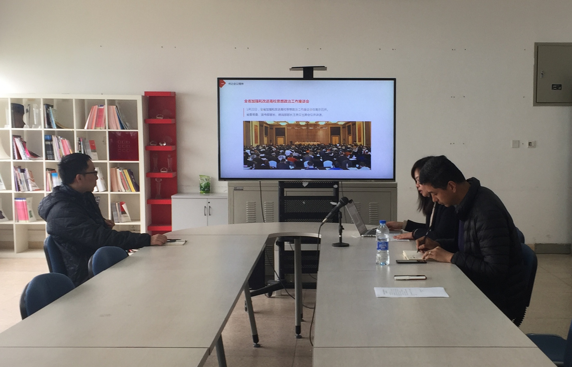 马华书记传达了1月22日召开的全省加强和改进高校思想政治工作座谈会精神。就座谈会的主要任务、重点内容和精神进行了解读。要求每一位老师深入学习领会好这次会议的精神,增强紧迫感、责任感、使命感,坚定做好高校思想政治工作的信心和决心。