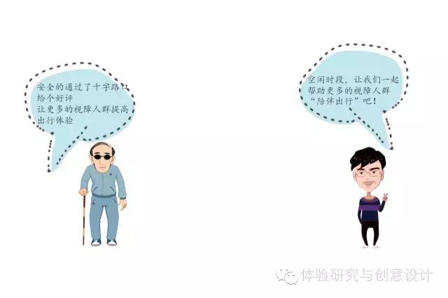 针对视障人群及其家人,分别设计了视障人群端和家人端两个产品。通过两方面人们的互动,使视障人士在出行过程中,获得家人们的关心和帮助。例如:陪伴同行、鼓励出行、评价帮助等,来帮助他们了解路况、标记障碍物等。