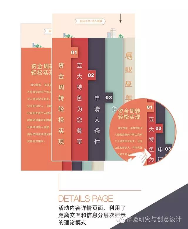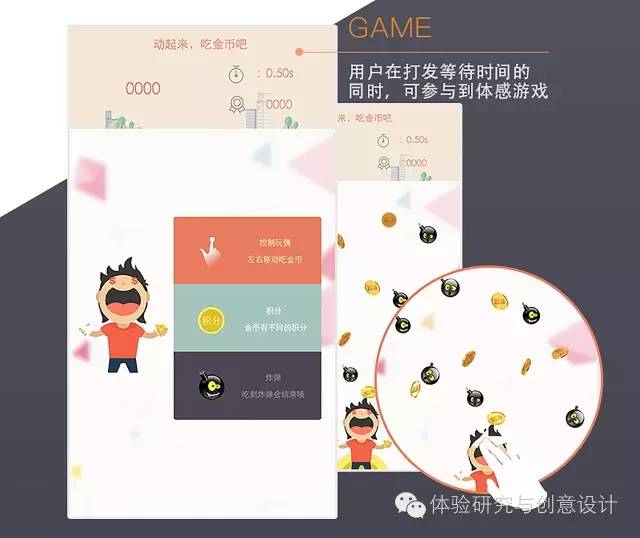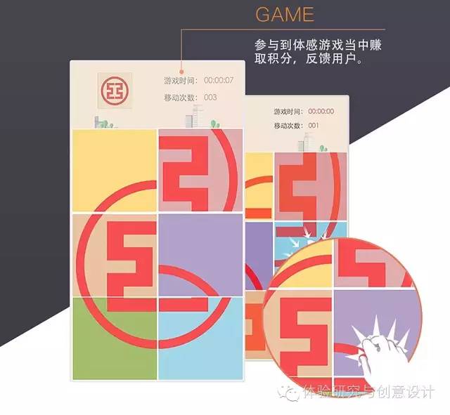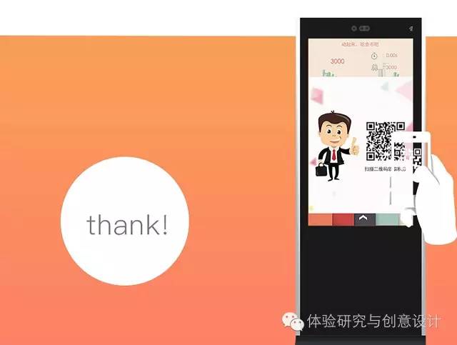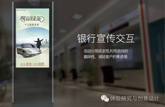 在此设计中利用了距离交互和信息分层次显示的理论模式,通过感应用户与体感机的距离,吸引用户与体感机进行互动、参与体感游戏,并分层次展示银行产品的内容信息。用户在打发等待时间的同时,也可参与到体感游戏当中赚取积分,反馈用户。