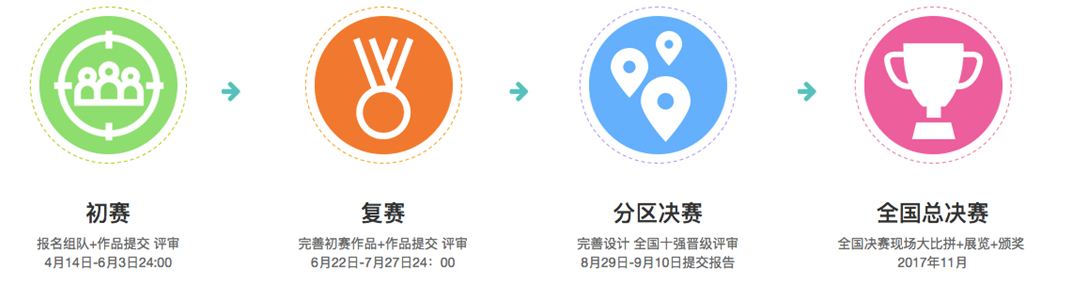 2017中国UXPA大赛的第一阶段初赛4月14日—6月3日;第二阶段复赛6月22号—7月27日;第三阶段分区决赛8月29—9月10号;最后阶段全国总决赛2017年11月。