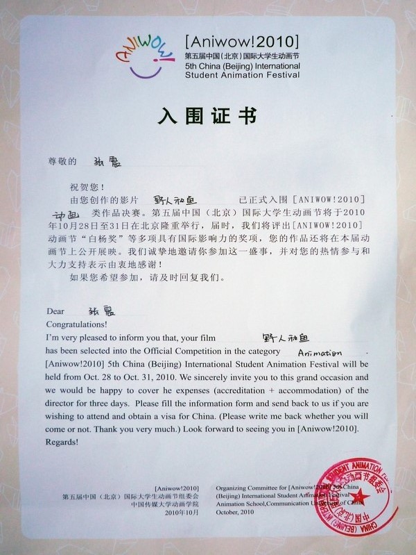 2009年张震作品《野人与鱼》荣获入围【Aniwow!2009】第4届中国(北京)国际大学生动画节"白杨奖"