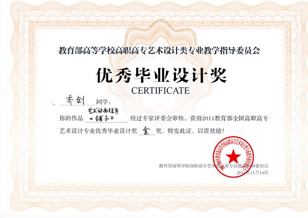 2011年乔剑动画作品《铺子》获得教育部高职高专艺术设计教学指导委员会第六届优秀毕业设计作品展金奖
