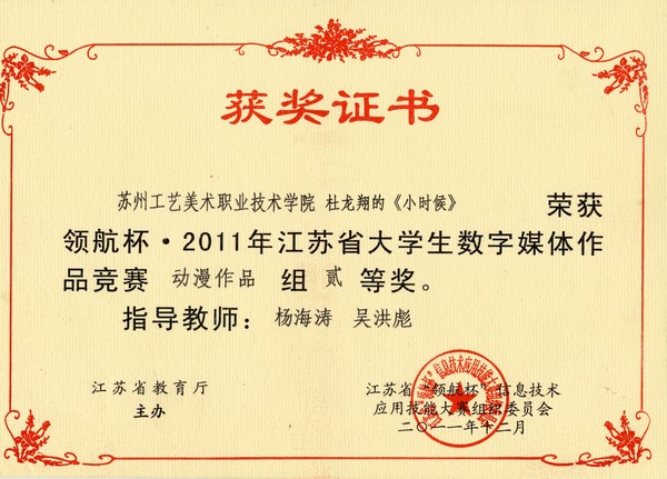 2011年杜龙翔《小时候》获得领航杯江苏省大学生数字媒体作品竞赛二等奖