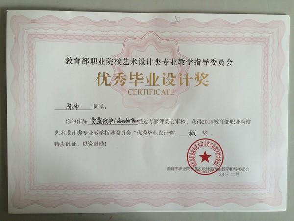 获得2016教育部职业院校艺术设计类专业教学指导委员会“优秀毕业设计奖”铜奖