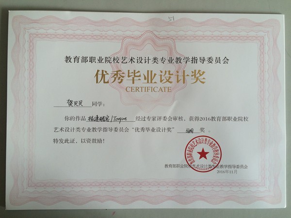 获得2016教育部职业院校艺术设计类专业教学指导委员会“优秀毕业设计奖”铜奖