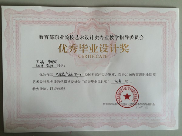 获得2016教育部职业院校艺术设计类专业教学指导委员会“优秀毕业设计奖”优秀奖