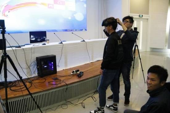 随后陈良骥先生对VR两大类进行了介绍。VR分为手机VR(通过头戴式眼镜左右眼的视觉差产生立体效果)和电脑VR(头盔自带显示屏)。陈良骥先生还对现在VR生产的三大厂家:HTC、FACEBOOK、SONY的VR设备进行了细节对比,告诉在场同学HTC的VR还可以在人蹲起时根据高度做出不同反应。
